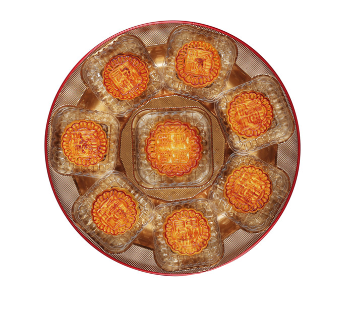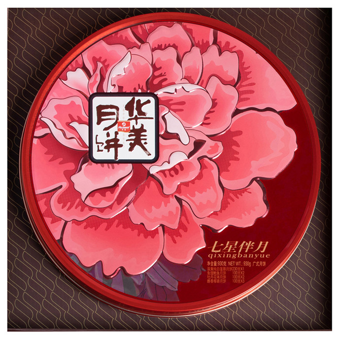 七星伴月堪稱華美月餅傳統(tǒng)系列中的高品質(zhì)代表之作,七星伴月的設(shè)計理念來源于七小行星伴隨月亮的天文景觀,喻意闔家大團(tuán)圓。整體盒形以正方形呈現(xiàn),大紅色做鋪底配以鏤空圓形天窗,畫面構(gòu)圖演繹出了“花前月下”美麗意境。