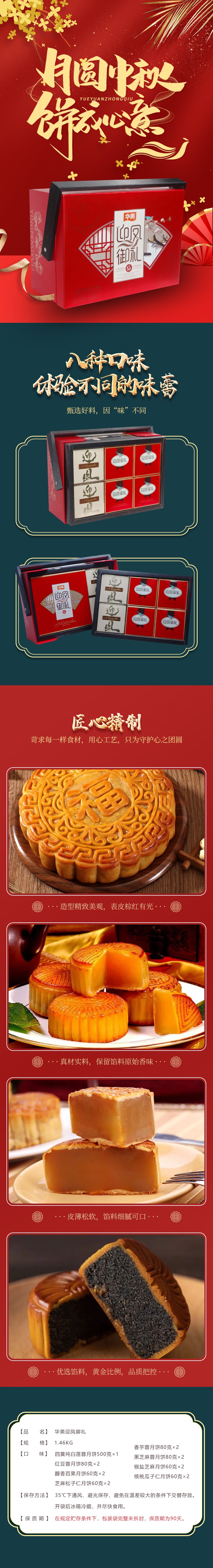 500克四黃純白蓮蓉月餅 X1,60克椒鹽芝麻月餅X260克芝麻松子仁月餅X2,80克香芋蓉月餅X280克紅豆蓉月餅X2,80克黑芝麻蓉月餅X260克醇香百果月餅X2,60克核桃瓜子仁月餅X2